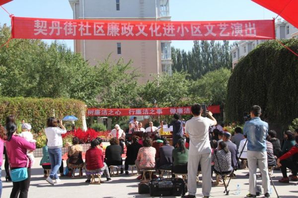 通过开展内容新颖、形式多样的文体活动,大力开展“廉政文化进社区、进小区”示范点建设工作。9月份为“廉政文化进小区宣传月”,通过文艺演出、制作宣传标语、宣传图版、印制宣传单等多种形式营造廉政氛围。契丹街社区“开心艺术团”在各小区开展“廉政文化进小区”文艺演出,其中自编的说唱快板《廉洁从政党兴旺》等节目深受广大群众的喜爱。