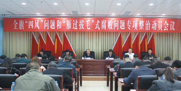 3月15日,全旗“四风”问题和“雁过拔毛”式腐败问题专项整治动员会议召开,落实上级“四风”问题和“雁过拔毛”式腐败问题专项整治工作会议精神,对全旗专项整治工作进行安排部署。旗委常委、纪委书记杨成雷出席会议并讲话。