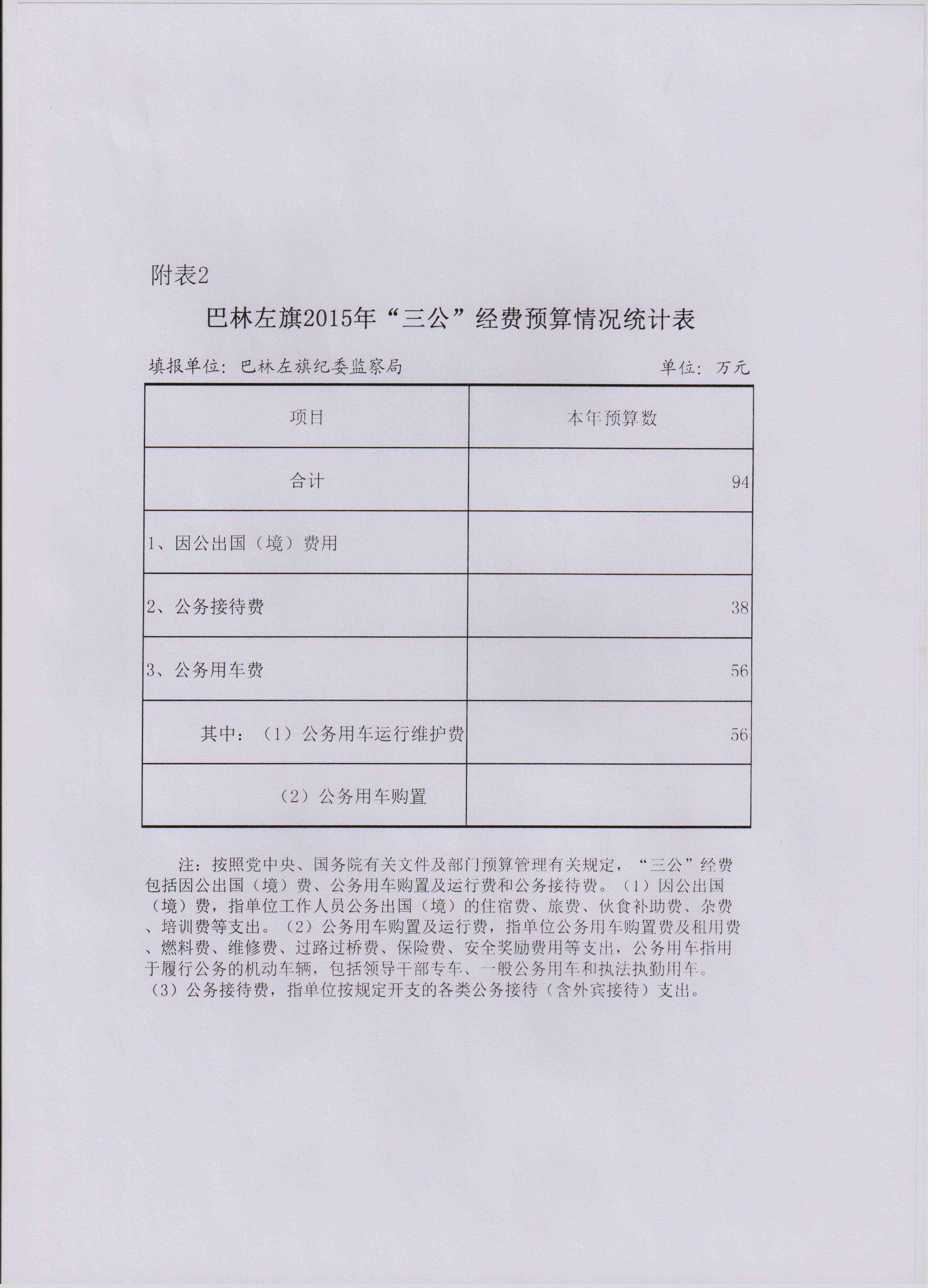 巴林左旗纪委监察局2015年“三公”经费预算情况统计表
